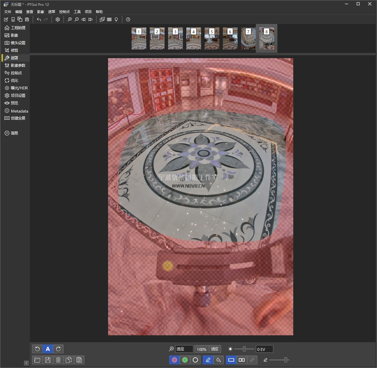 如上图:本次使用6+1+1模式拍摄,360度分6等份拍摄6张,顶部1张和地面1张。